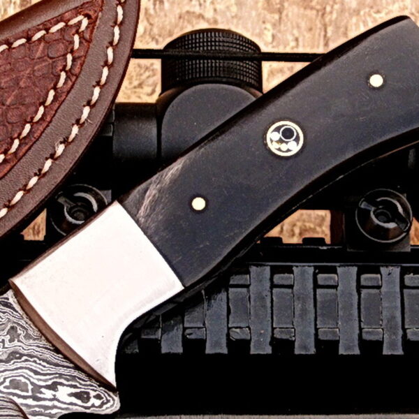 Crafty Orbit Brand Knife by York Vivant; Custom Handcrafted Damascus Steel Fixed Blade Hunting/Skinner/Camping Knife. Buffalo Horn & Mosaic Pin Handle.