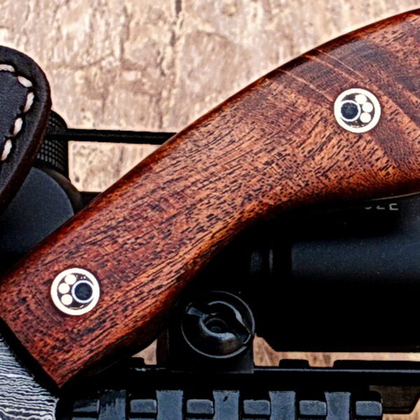 Crafty Orbit Brand Knife by York Vivant; Custom Handcrafted Damascus Steel Fixed Blade Hunting/Skinner/Camping Knife. Walnut Wood & Mosaic Pin Handle.