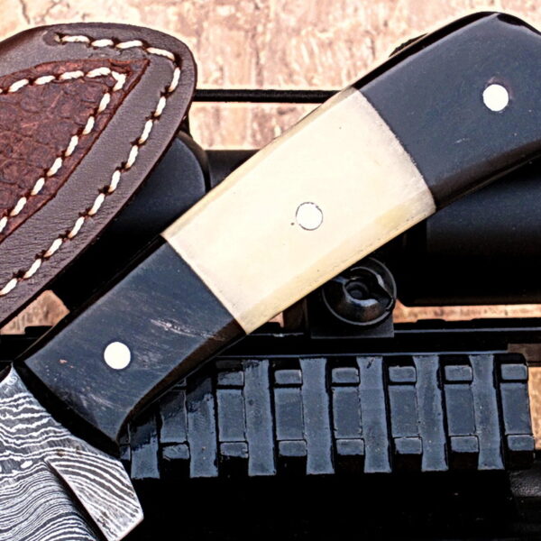 Crafty Orbit Brand Knife by York Vivant; Custom Handcrafted Damascus Steel Fixed Blade Hunting/Skinner/Camping Knife. Buffalo Horn, Mosaic pin Handle & Stainless Steel Guard.